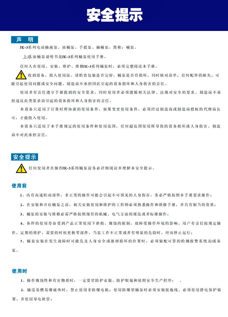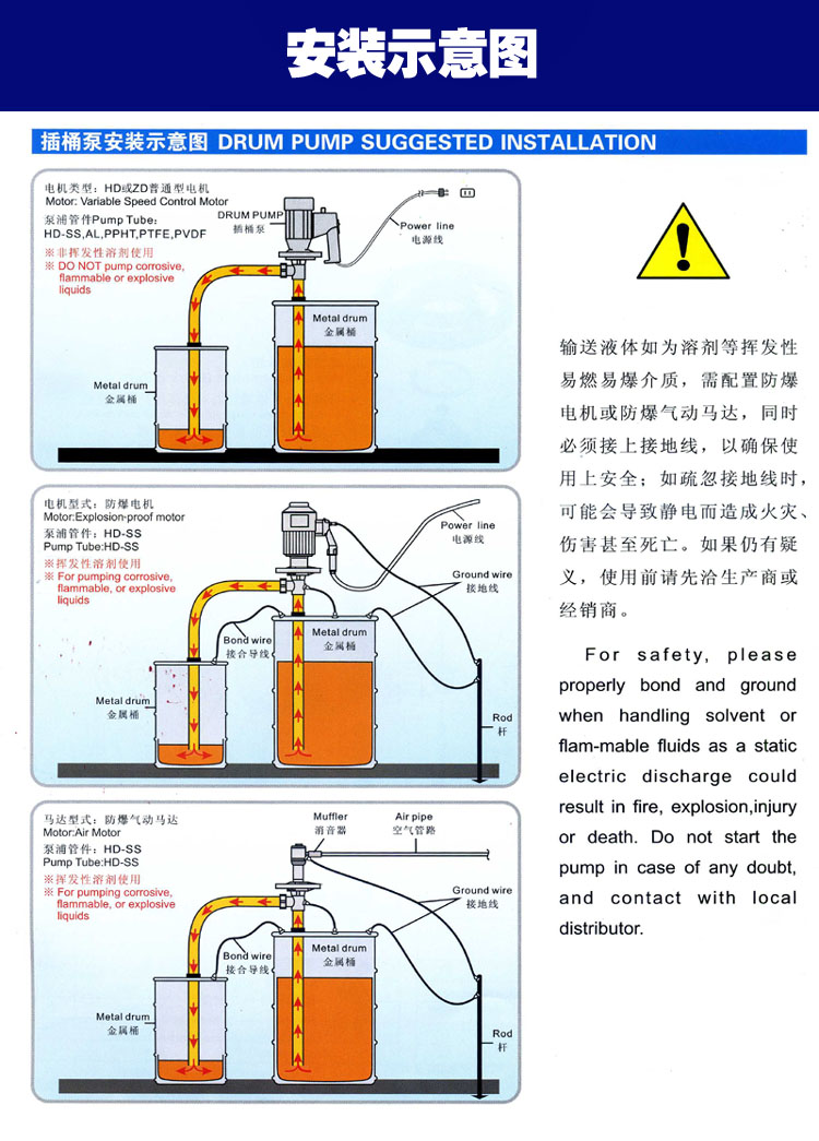 博生牌電動插桶泵(油桶泵)自主研制而成,各項技術指標均能達到樣機水平,并在樣機基礎上開發了不同使用場合不同抽吸液體的派生產品,該系列泵為輕便型管式軸流泵,具有效率高,使用、維護方便等特點。JK-3B-7RPP防爆型塑料油桶泵可以直接插入物料桶(大適用于符合GB/325-1991標準的鋼桶)中抽取桶中液體??奢斔透鞣N油料、帶腐蝕性化學藥水、其他液體。根據材質,電機不同,型號可分為: JK-3、JK-3B、JK-3-3、JK-3-7、JK-3-9、JK-3B-7系列(編號為SB-1,SB-1-1,SB-2,SB-2-1,SB-3,SB-4,SB-5,SB-6,SB-7,SB-8,SB-10系列)鋁合金,不銹鋼或防爆型。我們備有詳細資料,歡迎索取。博生該系列泵可按防爆區域和非防爆區域選用,凡在防爆區域使用配置防爆型電機,這類電機分三種機組型號,當使用條件含各種易燃易爆混合時,應選用高組級。